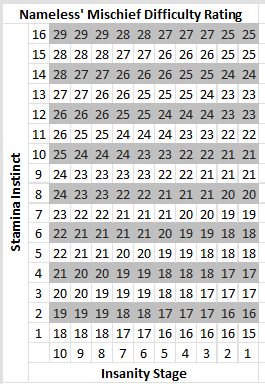 To check if the God of Chaos (Nameless) has distracted Necrosis from taking your life force, roll a self-stamina check using your Nameless’ Mischief Difficulty Rating, found in the corresponding table. A self-stamina check is 1d20 plus your stamina instinct.